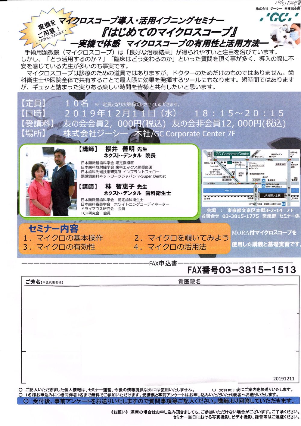 2019年12月11日GC主催の『はじめてのマイクロスコープ』セミナーを当院受付担当ならびに歯科助手と共に受講してきました。